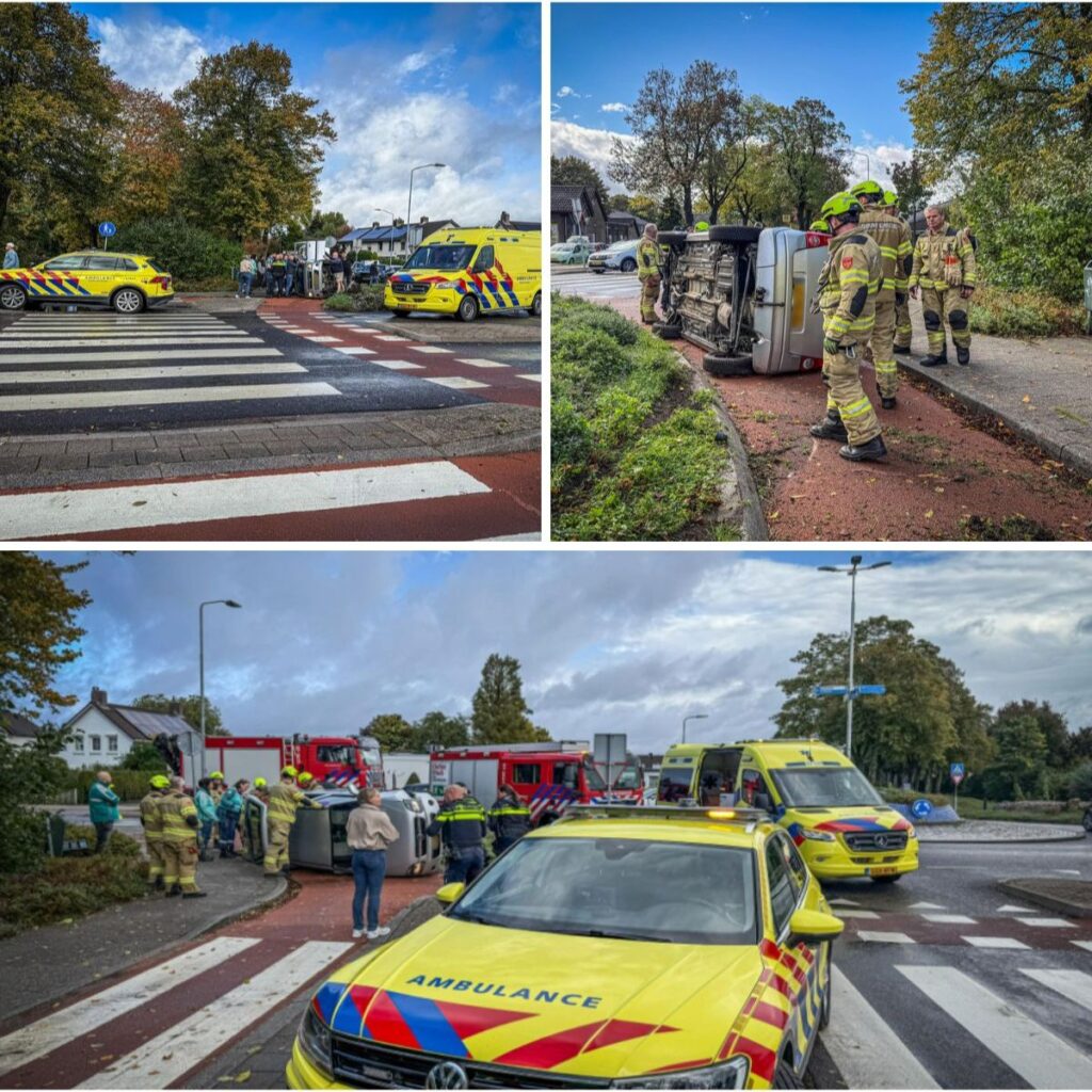Op de rotonde aan de Broeklanden is zaterdagochtend een auto op de zijkant terechtgekomen. Het ongeval gebeurde kort voor 11.30 uur.