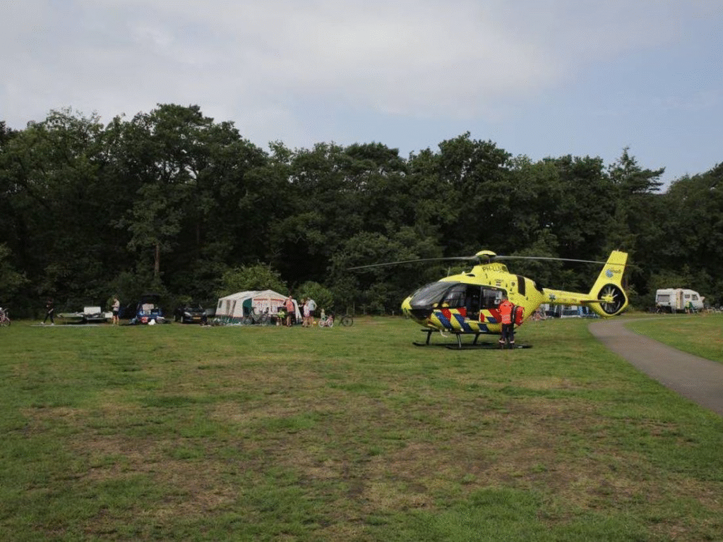 Meerdere ambulances, de brandweer en een traumahelikopter werden opgeroepen. De heli landde op een grasveld midden op de camping.