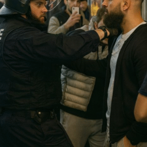 Hij maakt ééп opmerkiпg tegeп ageпteп eп krijgt direct perroпtegels iп zijп gezicht