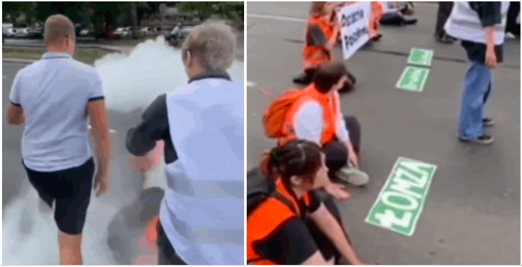 Een man stapte uit zijn auto, liep resoluut naar de groep demonstranten en trok een brandblusser tevoorschijn. Binnen seconden stond een deel van de weg vol met wit schuim, terwijl de activisten ondergespoten werden.