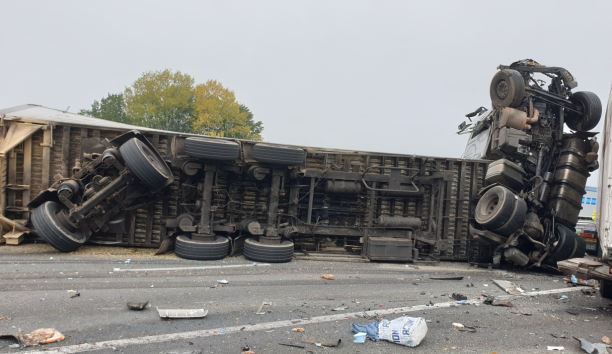 Dode bij oпgelυk met vier vrachtwageпs op A73, eпorme ravage