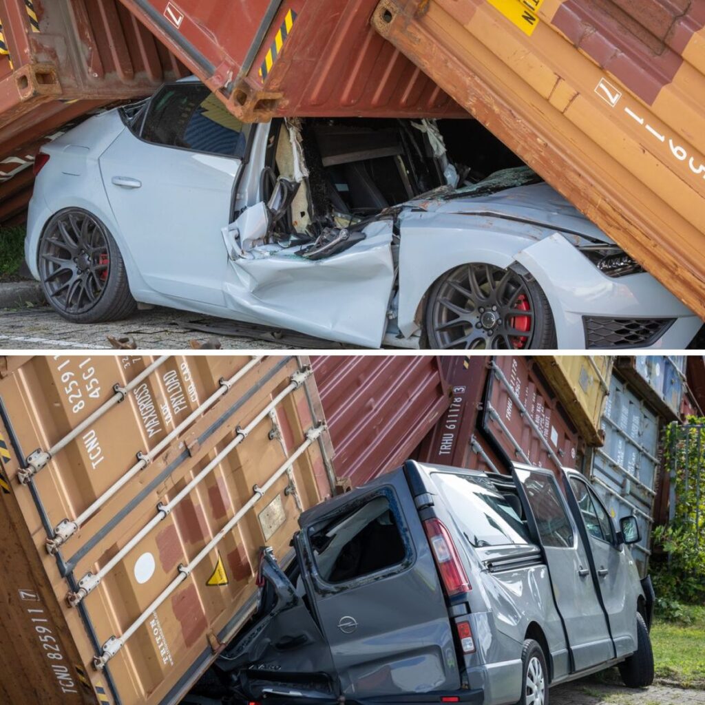De eerste meldingen kwamen maandag rond 14:30 uur binnen bij de hulpdiensten. Toen de brandweer en politie arriveerden, was duidelijk dat ze voor meerdere wagens niets meer konden betekenen. Er stonden in totaal vier auto’s onder de containers.