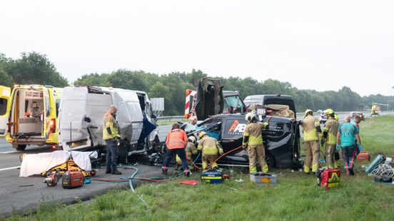Een zwarte bus met een lekke band stond op de pechstrook en werd geholpen door een tweede bus van een bandenservicebedrijf, meldt RTV Utrecht. Het derde busje botste op deze twee voertuigen.