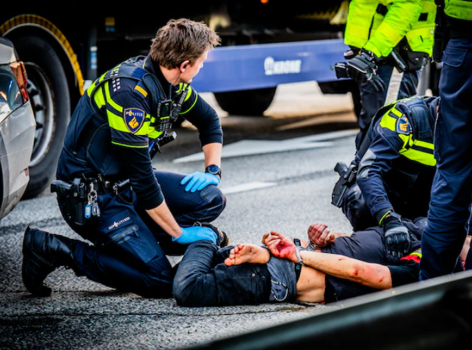 ‘De (bijna aangereden, red.) verbalisant heeft alleen door zijn eigen oplettendheid en wegstappen zwaar lichamelijk letsel kunnen voorkomen. Het is een wonder te noemen dat er ondanks het roekeloze verkeersgedrag van de verdachte geen verkeersslachtoffers zijn gevallen’, schrijft de Haagse rechtbank in een recent gepubliceerd vonnis. Ze ziet op beelden hoe de man ‘1 à 2 seconden’ nadat de agent opzij stapt precies op die plek passeert.