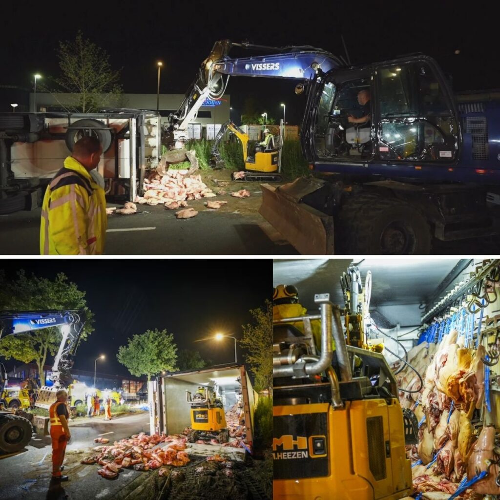 Volgens een correspondent ter plaatse was de chauffeur nog maar 200 meter verwijderd van zijn eindbestemming. De lading vlees was net ‘vers’ opgehaald bij een slachthuis in Boxtel en was op weg naar de laatste stop.