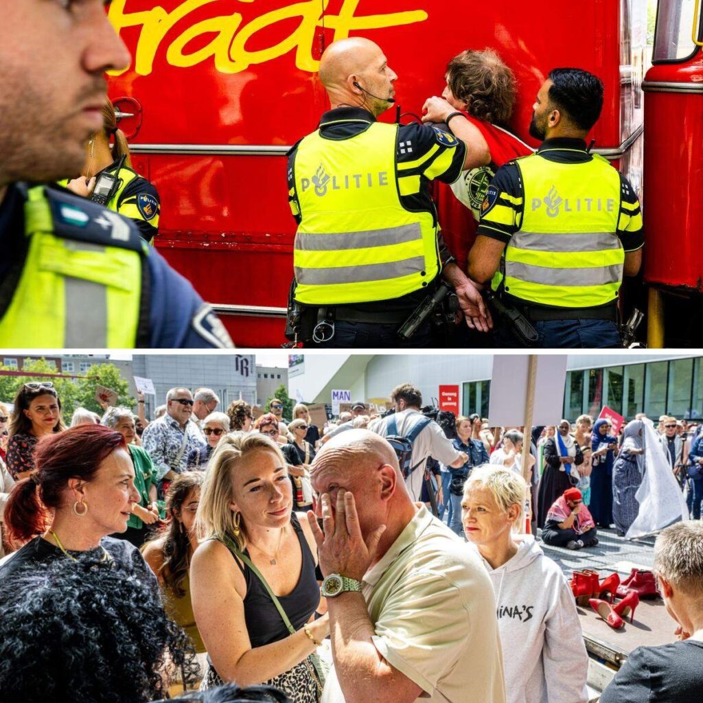 Enkele vrouwen vooraan begonnen te roepen: genoeg is genoeg! Deze leus werd al gedurende het begin van het protest herhaaldelijk gehoord. De man werd binnen een minuut door aanwezige politieagenten overmeesterd en afgevoerd. Hierbij bleef hij teksten roepen waar geen touw aan vast te knopen was.