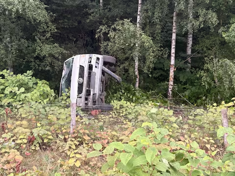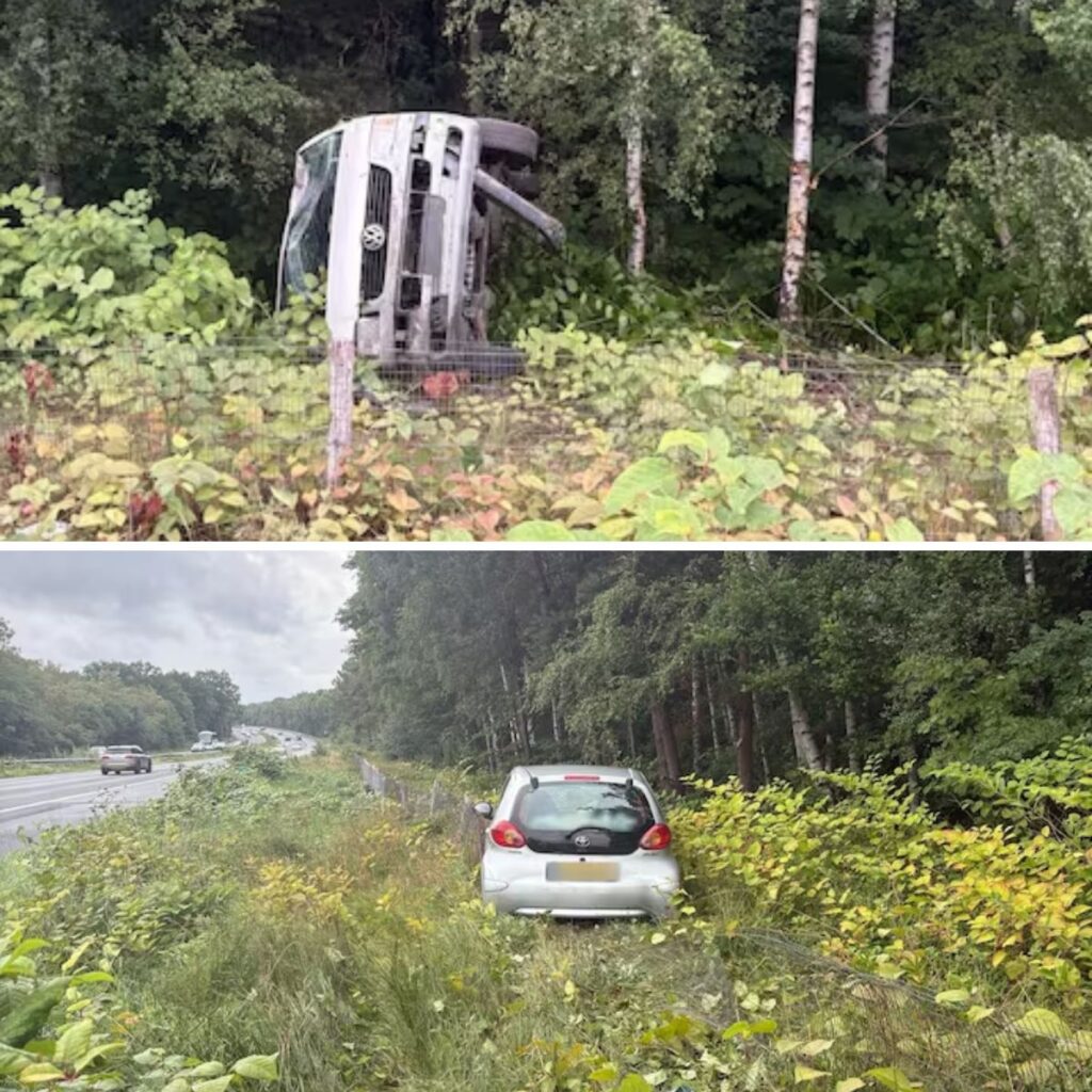 Beide wagens raakten van de weg en kwamen tot stilstand in de bosjes naast de snelweg. De ene auto reed daarbij op het gaas dat de weg en het bos van elkaar scheidt. Het andere voertuig belandde op zijn zij achter de omheining. Er was schade aan de voorkant. Er zaten barsten in de voorruit en het dak erboven deukte deels in.