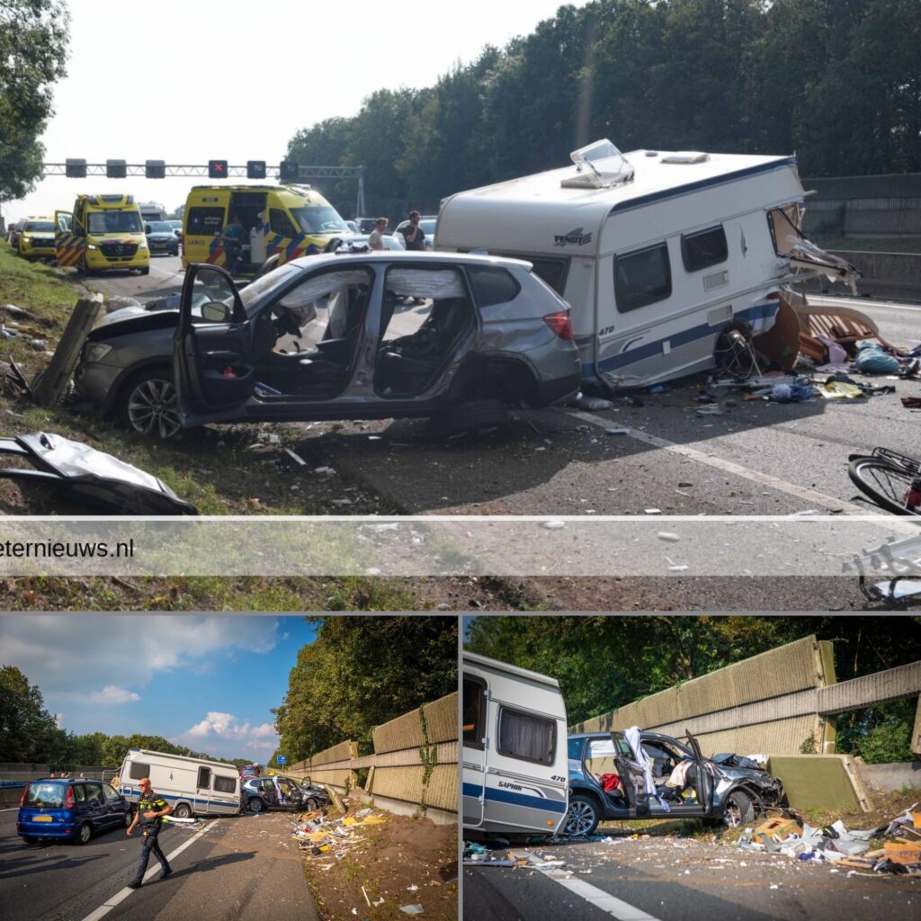 Het ongeval vond plaats rond 14.10 uur op de rijbaan richting Groningen. Een auto met caravan werd ingehaald door een BMW X3, waarvan de bestuurder vermoedelijk onwel raakte. De BMW kwam daarbij tussen de auto en de caravan terecht, waarna de caravan losschoot. Een andere auto botste vervolgens op de losgeraakte caravan, terwijl de BMW tegen een geluidswal tot stilstand kwam. De auto die de caravan trok, eindigde zwaar beschadigd tegen de middengeleider, ongeveer honderd meter verderop.