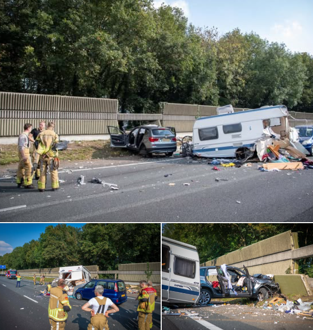 Het ongeval vond plaats rond 14.10 uur op de rijbaan richting Groningen. Een auto met caravan werd ingehaald door een BMW X3, waarvan de bestuurder vermoedelijk onwel raakte. De BMW kwam daarbij tussen de auto en de caravan terecht, waarna de caravan losschoot. Een andere auto botste vervolgens op de losgeraakte caravan, terwijl de BMW tegen een geluidswal tot stilstand kwam. De auto die de caravan trok, eindigde zwaar beschadigd tegen de middengeleider, ongeveer honderd meter verderop.