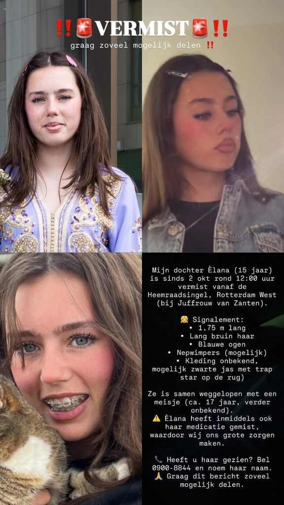 Sinds donderdagmiddag 2 oktober wordt de vijftienjarige Èlana vermist. Het meisje verdween rond het middaguur in de omgeving van de Heemraadsingel in Rotterdam-West. Volgens verklaringen van omstanders is zij mogelijk in gezelschap richting België vertrokken. De vermissing wordt door politie en familie als ernstig beschouwd. Vanwege het ontbreken van noodzakelijke medicatie benadrukt de familie dat de situatie zorgwekkend is. Hulpdiensten, waaronder de politie, coördineren de zoektocht en vragen dringend om informatie van mensen die Èlana mogelijk hebben gezien of gesproken in de afgelopen dagen.