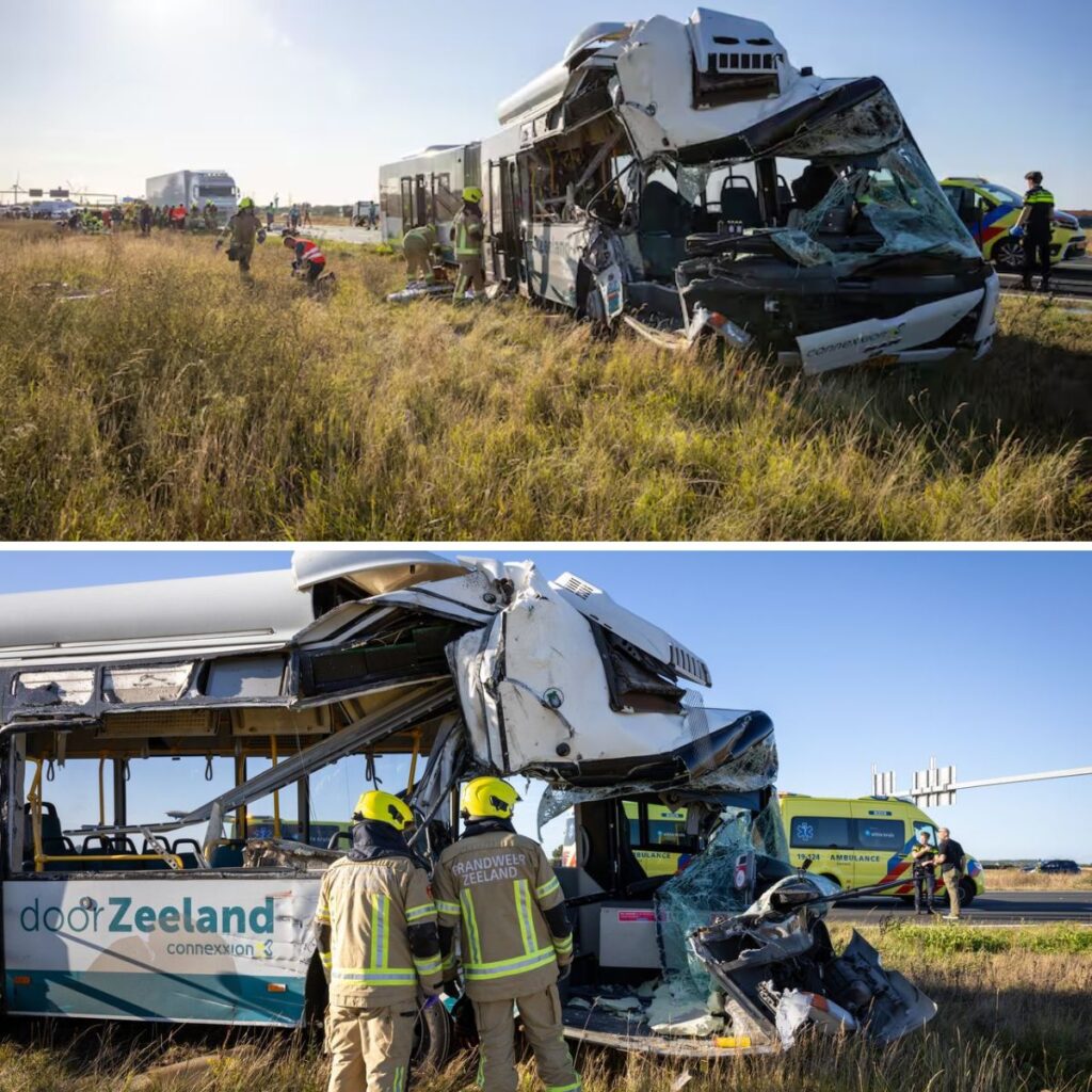 De bus botste achter op de vrachtwagen. Op foto’s is te zien dat zowel de bus als de vrachtwagen flink is beschadigd.