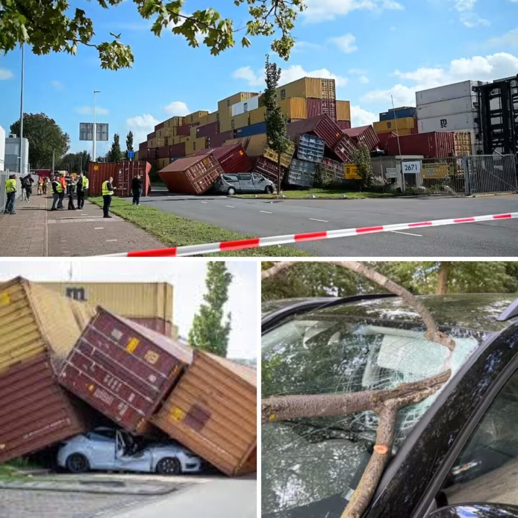 Omgewaaide containers pletten auto’s in Rotterdamse haven