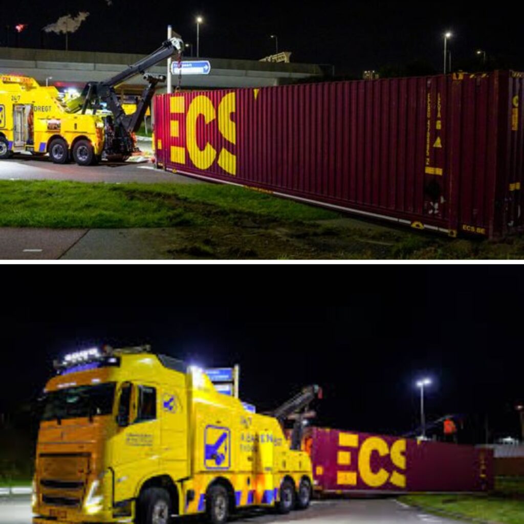 De Merseyweg aan de Botlek Rotterdam was dinsdagavond rond 21:45 uur tijdelijk niet begaanbaar. Dat kwam doordat een vrachtwagen een grote zeecontainer verloor. De container belandde op de weg.